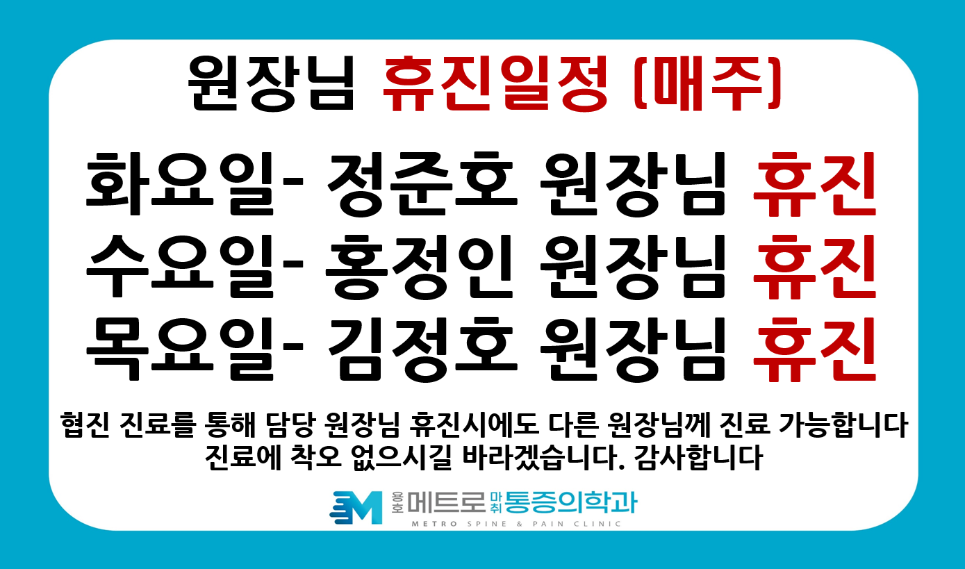 목, 척추, 관절, 등 통증질환은 우리의 일상에서 쉽게 찾아볼 수 있습니다. 개인별 맞춤 치료 시스템을 바탕으로 근본적인 통증의 이유를 찾아내어 예방하고 치료하는 것이 중요합니다. 최소한의 치료로 최대의 효과를 얻을 수 있도록 최선을 다하겠습니다. 감사합니다.